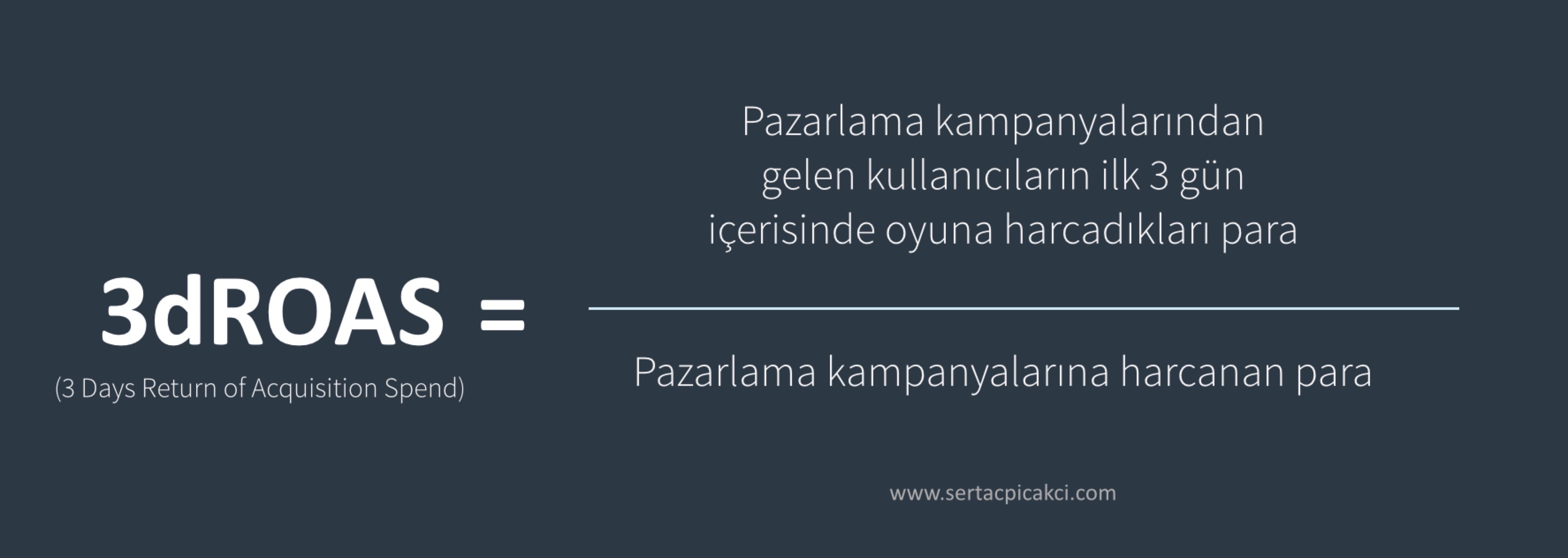 Sürekli artan rekabetle birlikte oyun geliştiricilerinin oyunlarını son kullanıcıya ulaştırması da maliyeti giderek artan bir iş haline geldi. Bundan 2-3 yıl öncesinde pazarlama giderleri çok sorgulanmıyordu fakat günümüzde pazarlama giderleri oyun geliştirme giderlerinin 2-3 katına ulaştığı için harcanan her bir kuruşun çok fazla önemi olmaya başladı. Harcanan paraların ne kadar iyi bir şekilde harcandığını görmek için ise ürün yöneticileri 3dROAS dediğimiz metriğe bakmaya başladı. Bu metrik sayesinde ürün yöneticileri söz konusu oyuncuları kazanmak için harcadıkları paranın ne kadarını ilk 3 gün içerisinde geri elde ettiklerini görebilirler. 3dROAS’i daha iyi anlamak için basit bir örnek vermek istedim;