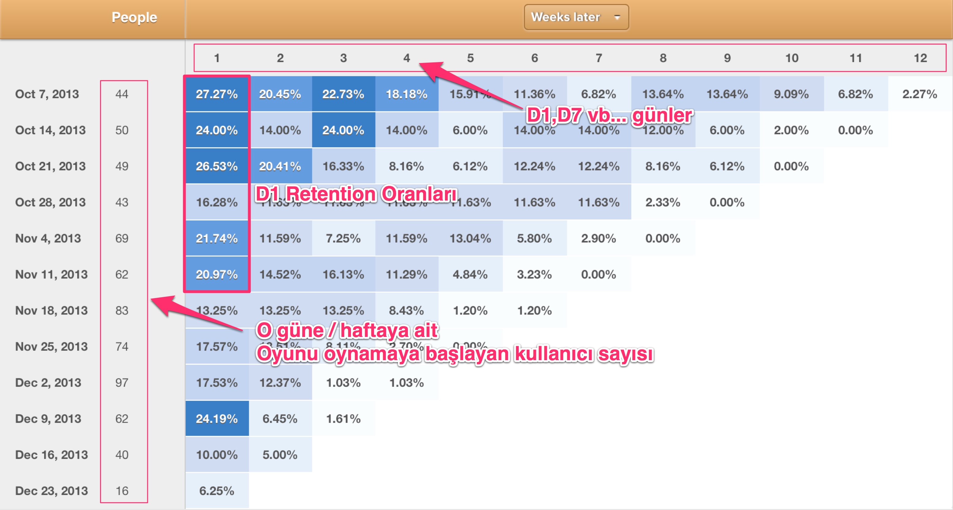 Bu tablodan görüleceği üzere 7 Ekim haftasında oyunu oynamaya başlayan oyuncuların D1 retention’ı diğer haftalara göre daha yüksek. Bununla birlikte 18 Kasım haftasında oyunu oynamaya başlayan kullanıcıların D1 retention’ı diğer haftalara göre daha düşük. Bu noktada ürün yöneticilerinin sorunun kaynağını araştırması gerekir.