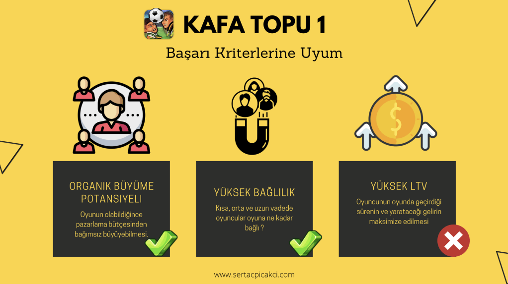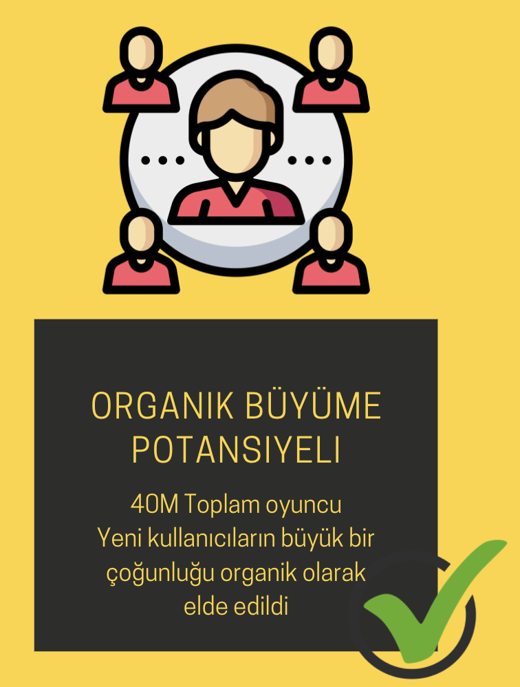 - Ağızdan ağıza büyüme potansiyeli : Kafa Topu’nun çok eğlenceli ve neredeyse eskimeyecek oyun mekaniği potansiyeli var. Oyunu indirdiğinizde ilk aldığınız aksiyonlardan bir tanesi arkadaşlarınızı oyuna davet edip onlarla beraber oynamak ve onlara Kafa Topu’nda ne kadar iyi olduğunuzu göstermek. Eğlenceli oyun mekaniğinin yetenek ile birleştiği bir dünyada ağızdan ağıza büyüme potansiyelini olabildiğince maksimize etmiş oluyorsunuz. Her gelen kullanıcının yeni bir kullanıcıyı çağırdığı bir dünyada organik büyüme ister istemez başarılmış oluyor.