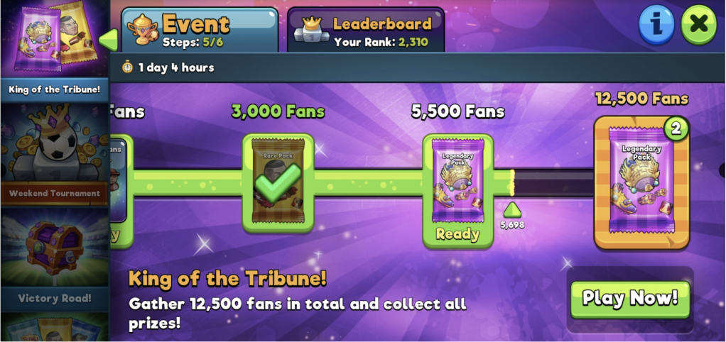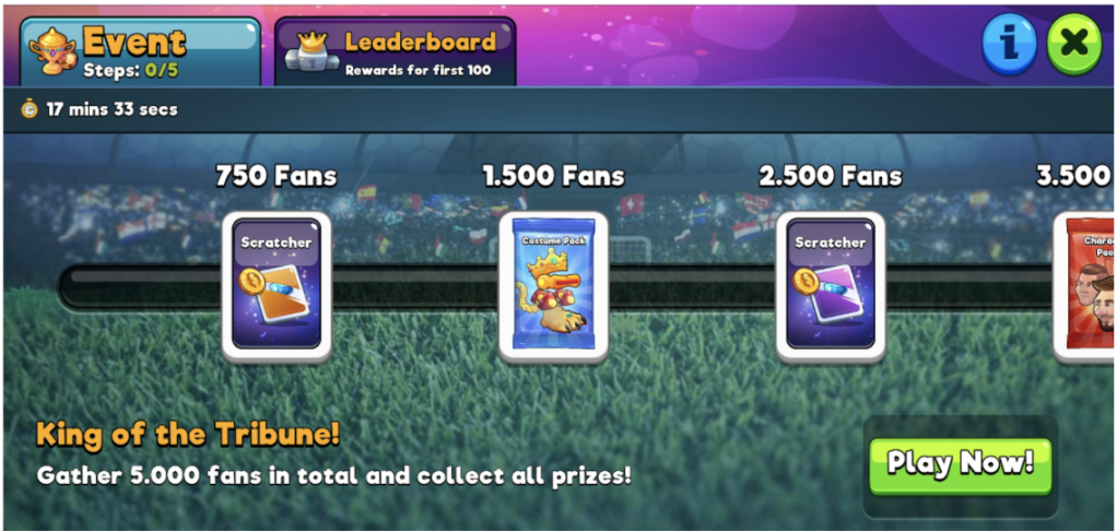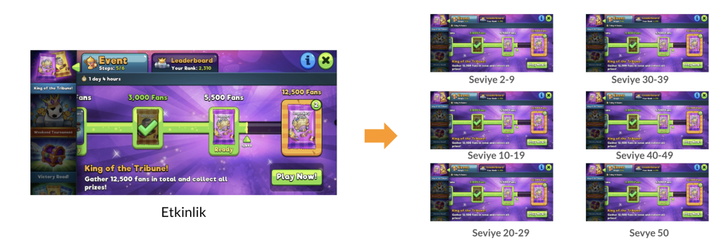 - Aşağıdaki örnekte de görüleceği gibi oyuncular etkinlik süresince maçlar kazanarak toplayacağı taraftarlar belirli sayılara ulaştığında çeşitli ödüller kazanabiliyor. 10 dakikası olan oyuncu sadece 1 adım tamamlayabiliyorken, 60 dakikası olan bir oyuncu daha fazla adım tamamlayabiliyor ve ona göre kazandığı ödüller de artıyor.