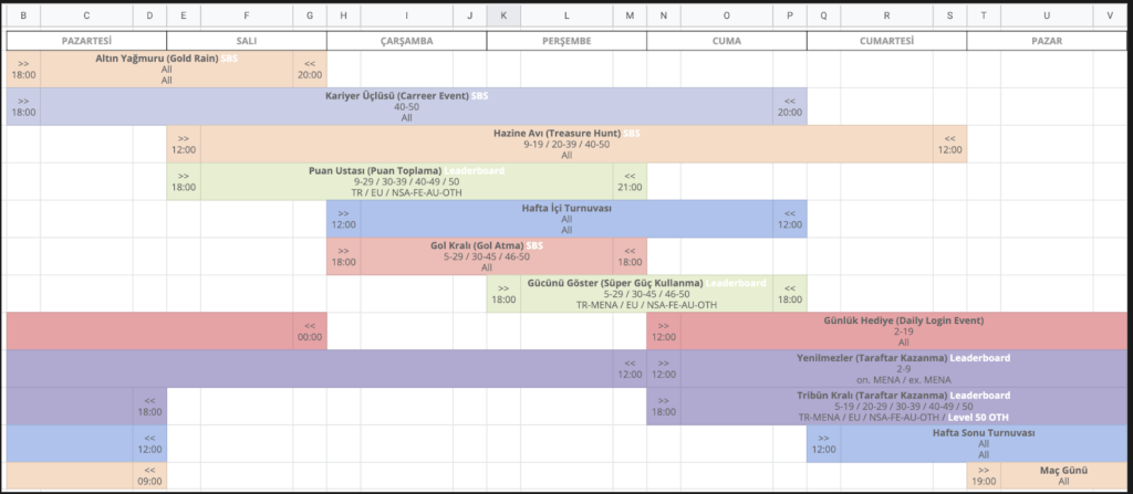 Kafa Topu 2’yi ilk çıktığımızda elimizdeki live ops alt yapısı sayesinde uzaktan farklı tiplerde kısa süreli etkinlikler açabiliyorduk. Bu etkliklerin başlangıç – bitiş tarihleri, verilecek ödüller, oyuncuların gerçekleştirmesi gereken hedefler, görsel materyaller gibi parametreler uzaktan değiştirilerek oyunun sürekli taze kalması sağlanıyordu.