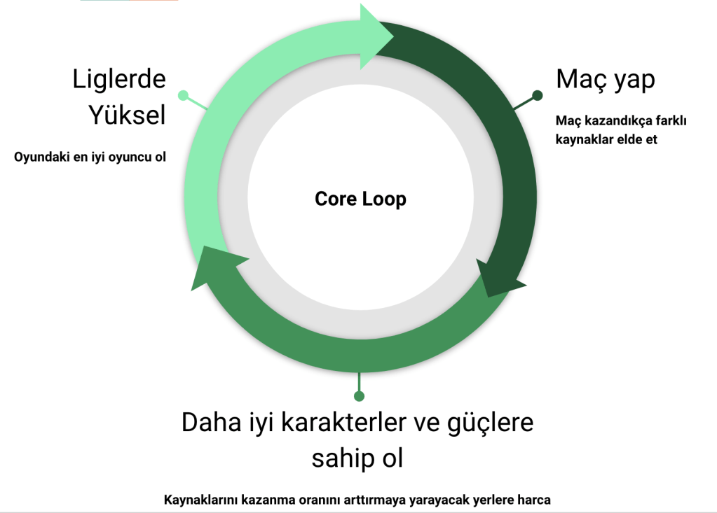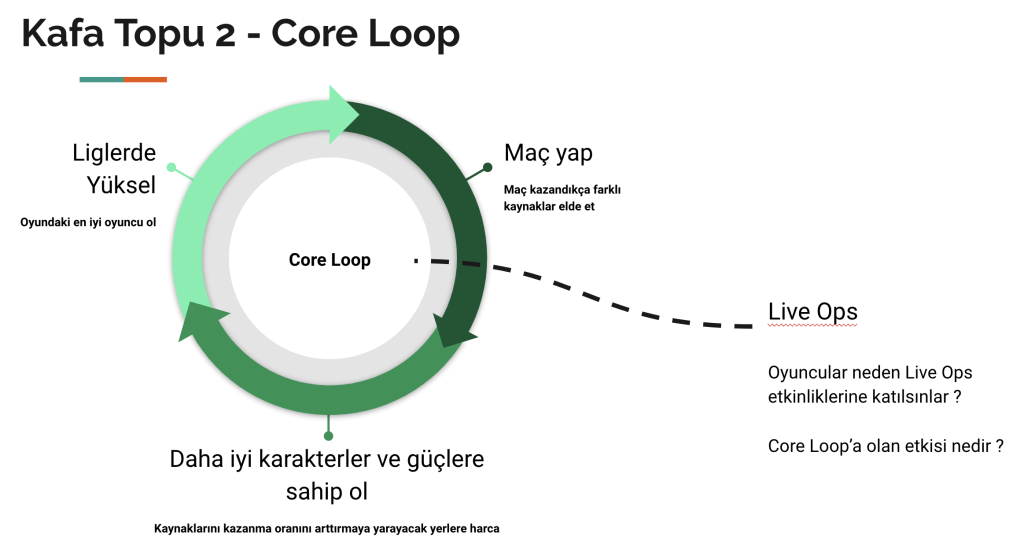 Core Loop : Oyunda temel olarak neler yaparak ilerleyeceğinizi gösteren aksiyon setlerine “core loop” denir. Kafa Topu 1’in en basit haliyle “core loop”u aşağıdaki gibi.