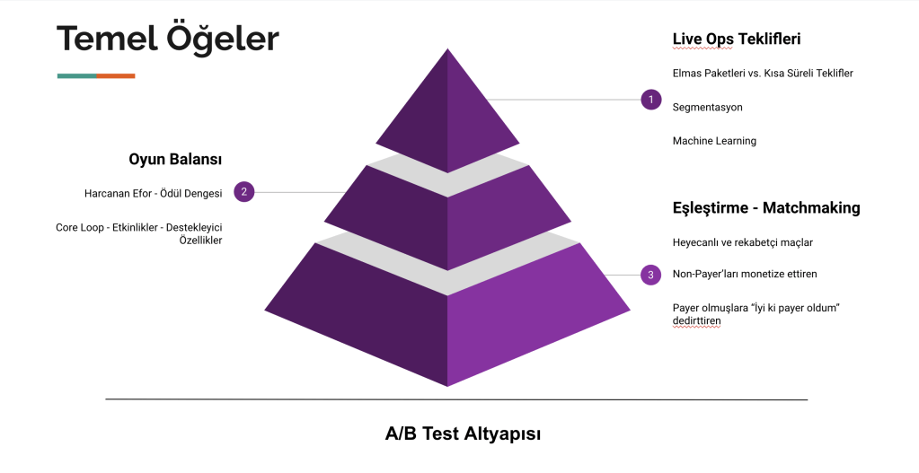 Öncelik olarak piramitte de görüldüğü gibi sağlıklı bir eşleştirme sisteminin olmadığı bir dünyada oyun balansı ve live ops teklifleri çok anlam ifade etmeyecek.