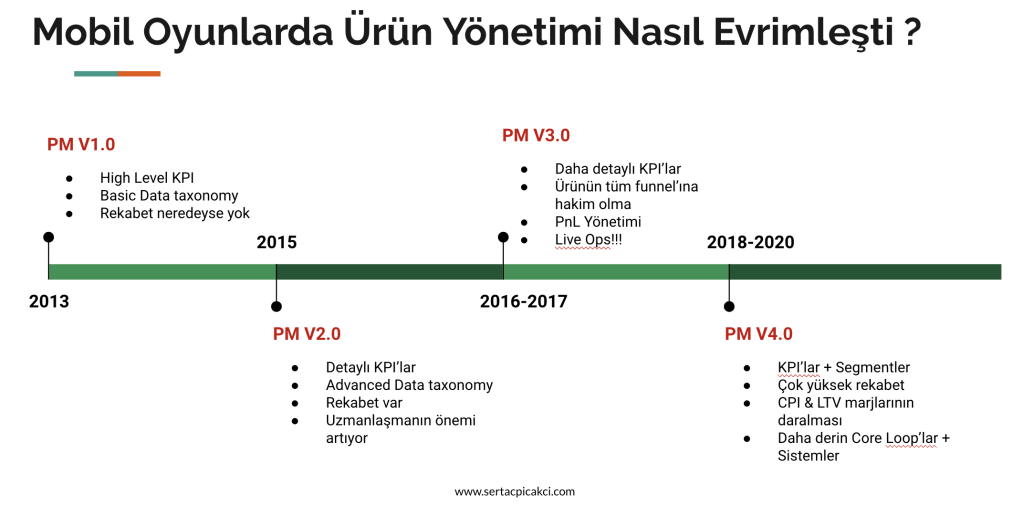 2013 – 2020 yılları arasında “mobil oyunlarda ürün yönetimi” disiplininin nasıl değiştiğini aşağıdaki grafikte açıklamaya çalıştım.