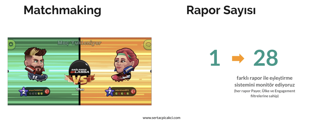 Zaman içerisinde ihtiyaçların değişmesi ile birlikte oyundaki eşleştirme sistemini önceden tek bir rapor ile takip ediyorken şu anda 28 tane farklı rapor ile çok yakından takip ediyoruz.